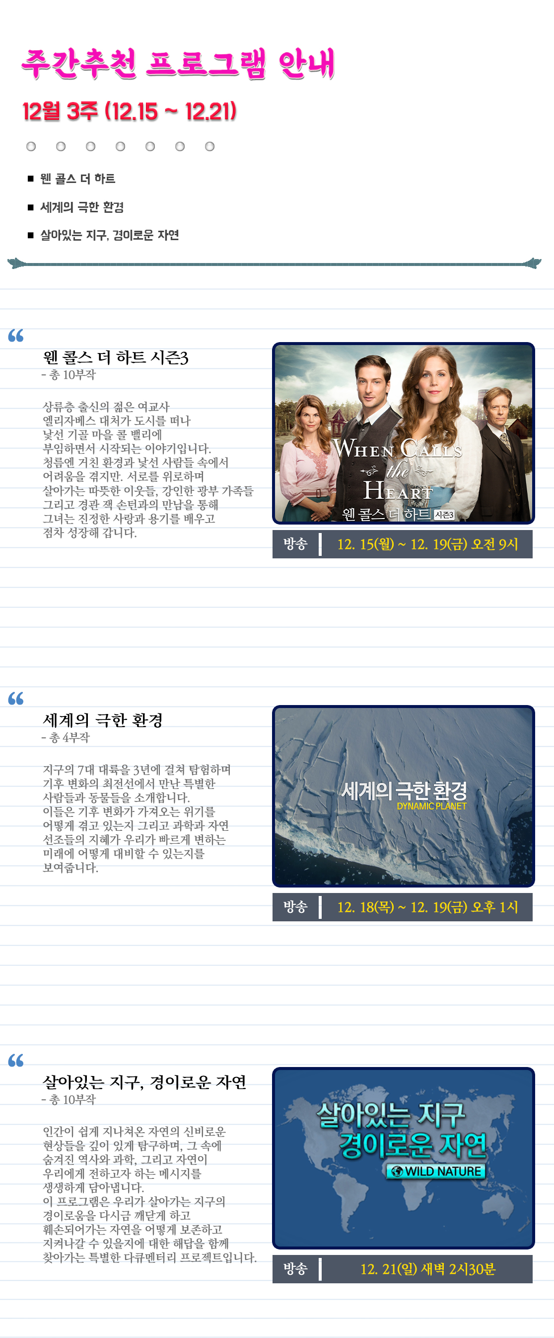 이 프로그램은 우리가 살아가는 지구의 경이로움을 다시금 깨닫게 하고 훼손되어가는 자연을 어떻게 보존하고 지켜나갈 수 있을지에 대한 해답을 함께 찾아가는 특별한 다큐멘터리 프로젝트입니다.